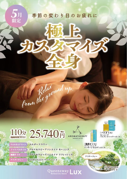 株式会社BEST HERBS(代表取締役社長 塚田 正之:東京都新宿区市谷仲之町3-5)が運営するQueenswayLUX(https://www.queensway-group.jp/qw-lux_lp.html)では、季節の変わり目による心身の不調や疲れに対応した、【極上カスタマイズ全身コース】を5月限定でご提供いたします。