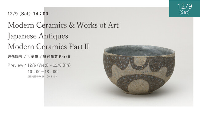 Shinwa Wise Holdings 株式会社 (本社:中央区銀座 代表取締役 倉田陽一郎)の主要子会社である Shinwa Auction株式会社(本社:中央区銀座 代表取締役 倉田陽一郎)は、2023年12月9日(土)に自社ギャラリーにて近代陶芸/古美術/近代陶芸PartIIオークションを開催します。松尾芭蕉の画賛、足利義政の短冊、古今和歌集「民部切」の断簡といった歴史の深い古美術から、荒川豊蔵、加守田章二、北大路魯山人などの近代陶芸まで、計302点が競りにかけられます。オークション・下見会は入場無料・見学のみのご入場も可、入札は会場での直接入札の他、事前入札、Webからのリアルタイム入札(ライブビッディング)にて受付けています。