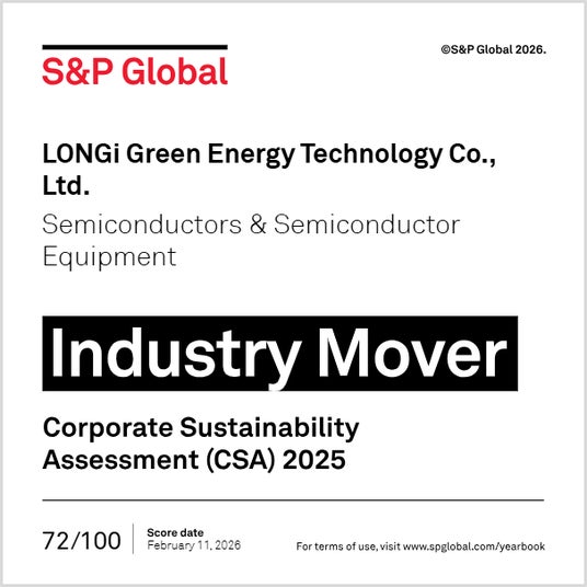 「半導体・半導体製造装置」業種では289社が評価され、イヤーブックに選定されたのは20社にとどまります。その中でLONGiは、高い評価スコアとともに前年比での顕著なスコア向上を実現し、継続的な取り組みと情報開示の両面において評価されるとともに、各業種内で前年からスコアが最も向上した企業1社にのみ与えられる「Industry Mover」にも選出されました。