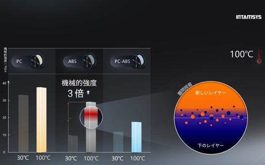 これまでのFUNMAT PRO310を大幅にグレードアップした「FUNMAT PRO310 NEO」は500mm/sの「最大移動速度」、300mm/sの「高速印刷」を実現。材料の機械強度を高める、高温チャンバー「100℃対応」。