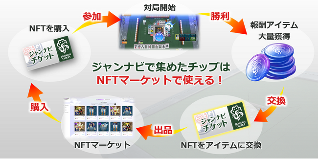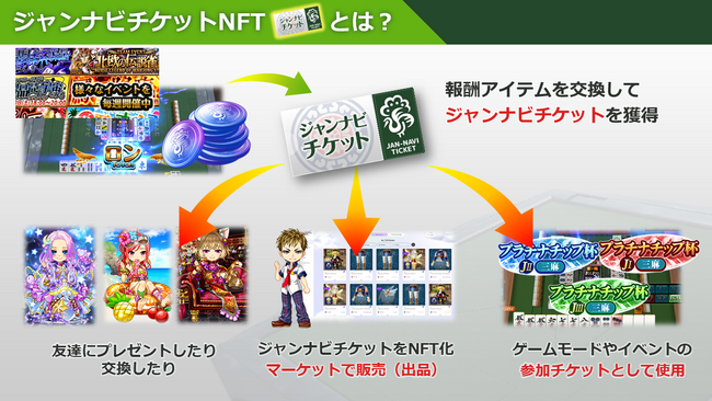 ジャンナビゲーム内で獲得したジャンナビチケットをNFTアイテムとして取り出し、お客様自ら外部のNFTマーケットプレイスにて販売することができます。