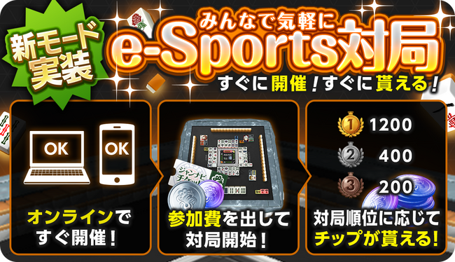 「e-Sports対局」は参加料を支払い、対局後の順位に応じてスポンサーからプラチナチップを獲得することができる普段とは違った新感覚の麻雀モードです。