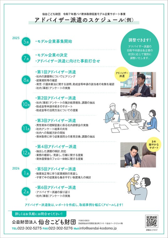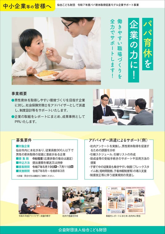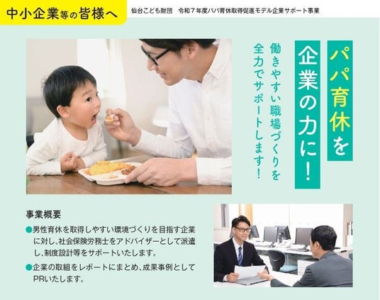 「パパ育休取得促進モデル企業サポート事業」では、男性が育児休業を取得しやすい職場環境づくりを進めようとする企業をモデル企業に選定し、社会保険労務士等をアドバイザーとして派遣して制度設計等をサポートします。また、企業の取組をレポートにまとめ、成果事例としてPRします!