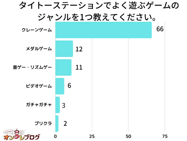 「タイトーステーションでよく遊ぶゲームのジャンルを1つ教えてください。」アンケート調査した結果、1位は『クレーンゲーム』でした。