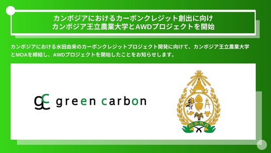 Green Carbon株式会社(代表取締役:大北潤、以下Green Carbon(読み:グリーンカーボン))はこの度、カンボジアにおける水田由来のカーボンクレジットプロジェクト(以下、本プロジェクト)開発に向けて、カンボジア王立農業大学(Royal University of Agriculture、以下RUA)とMOAを締結し、カンボジア北西部のBattambangエリアでAWDプロジェクトを10月から開始したことをお知らせします。カンボジアにおいて、並行して進めているバイオ炭プロジェクトを活用し、AWD(間断灌漑※1)及びバイオ炭双方の事業拡大を進めることで、カンボジアの経済発展に寄与することを目指します。