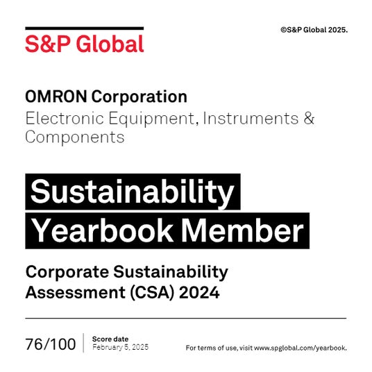 S&Pグローバル社は毎年、世界の大手企業を対象に、「環境」「社会」「ガバナンス&経済」の3つの側面から企業の持続可能性(サステナビリティ)を評価しています。今年は62の業界で世界7690社以上を対象に評価を実施し、各業界上位15%以内のスコアを獲得し、かつコーポレートサステナビリティ評価(CSAスコア)が業界トップ企業の30%以内の企業780社(うち日本企業54社)がイヤーブック・メンバーに選定されました。オムロンは、電子装置・機器・部品業界における環境・社会・ガバナンス&経済の取り組みが評価され、5年連続の選定となりました。