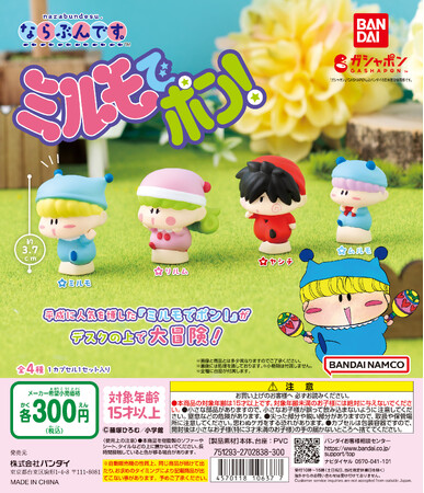 株式会社バンダイ ベンダー事業部(本社:東京都台東区)は、月刊少女まんが誌「ちゃお」にて2001年~2005年の間連載された篠塚ひろむ先生の大ヒット作品『ミルモでポン!』のキャラクターをフィギュアにした、「ミルモでポン! ならぶんです。」(1回300円・税10%込、全6種)を、2023年12月第2週から順次、全国のガシャポンバンダイオフィシャルショップ、玩具売り場・量販店・家電店などに設置されたカプセルトイ自販機にて発売いたします。