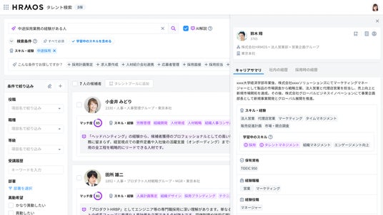「社内版ビズリーチ by HRMOS」は、ビズリーチで蓄積されたデータを学習した生成AIを搭載し、社内レジュメや社内ポジション要件の自動生成、高精度な人材検索とレコメンデーションを通じて、社内人材と社内ポジションの最適なマッチングを実現するものです。