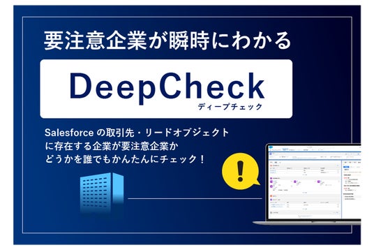ユーソナー株式会社(本社:東京都新宿区、代表取締役会長:福富 七海、代表取締役社長:長竹 克仁、以下ユーソナー)は、企業の営業・財務部門の負担ともなっている取引先チェック(コンプライアンスチェック、支払い能力チェック)業務を大幅に軽減する新サービス「DeepCheck(ディープチェック)」の提供を開始しましたのでお知らせします。取引先チェックで必要となる登記簿など根拠情報までワンストップで提供する、取引先チェックサービスの決定版です。