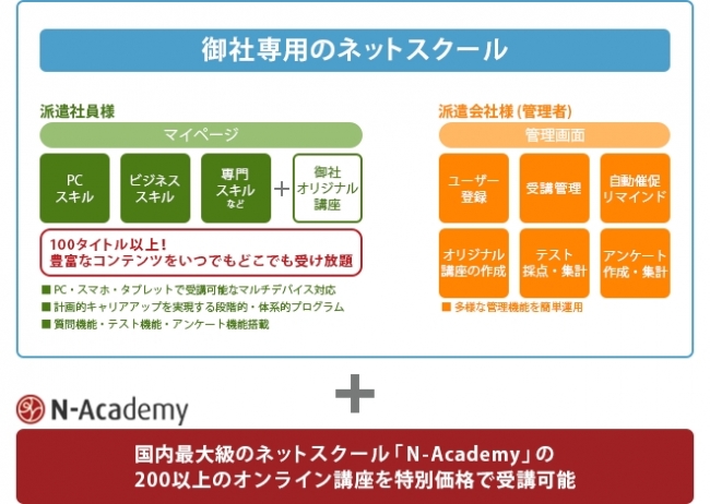 こうしたニーズにお応えすべく、厚生労働省が掲げる「派遣社員のキャリアアップにつながる教育訓練」の要件を満たす派遣会社様向けのキャリア形成支援制度対応eラーニングコンテンツサービスを、受講者数23万人超(※)を誇る国内最大級のネットスクール「N-Academy」が、200以上の講座配信実績を強みに低価格でお届けするものです。