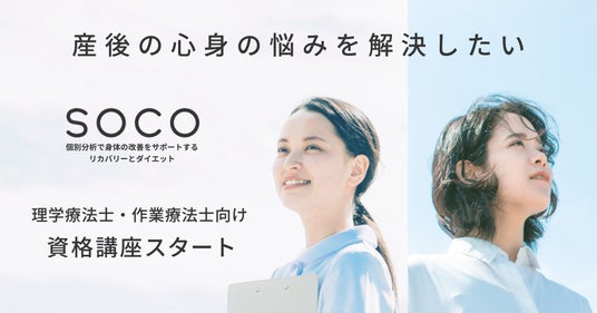 起業家の世界観に投資するGOB Incubation Partners株式会社(東京都渋谷区、代表取締役社長CEO:高岡泰仁、以下「GOB」)が運営する産後女性向けのリカバリーとダイエットサービス「SOCO」は、2024年1月19日に「SOCO認定資格講座」をスタートします。対象は女性の理学療法士・作業療法士で、資格取得によって新たな働き方や活躍の場を提供します。