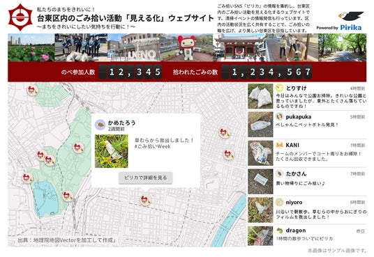 そこで、このたび台東区では、区内での清掃活動の把握及び可視化とともに、参加者同士の交流を通じた活動の活性化を目指し、ごみ拾いSNS「ピリカ」を活用したピリカ自治体版 見える化ページのサービスを導入。「台東区版ごみ拾い活動「見える化ページ」」の運用を開始しました。