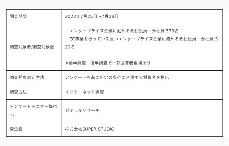 D2C(※1)支援事業やECプラットフォーム「ecforce」(イーシー・フォース)を提供する株式会社SUPER STUDIO(所在地:東京都目黒区、代表者:代表取締役 林 紘祐、以下:SUPER STUDIO)は、エンタープライズ企業に務める会社役員・会社員573名とEC事業を行っている且つエンタープライズ企業に務める会社役員・会社員329名を対象に、「大企業のSaaS導入に関する意識・実態調査」を実施しました。