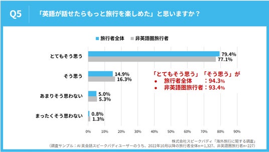 - 非英語圏旅行者の93.4%が「英語が使えたらもっと楽しめた」と回答