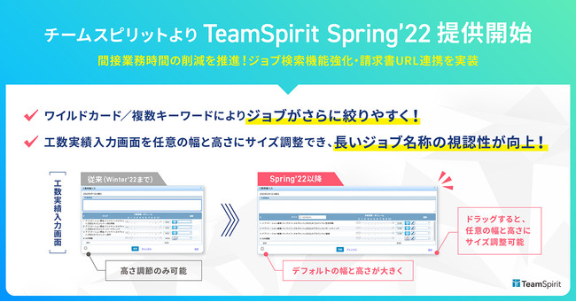 働き方改革プラットフォーム「TeamSpirit」シリーズを開発・提供する株式会社チームスピリット(代表取締役:荻島 浩司、 以下 チームスピリット)は、働き方改革プラットフォーム「TeamSpirit」の新バージョン、「TeamSpirit Spring’22」の提供を2022年3月17日(木)より開始いたしました。「TeamSpirit Spring'22」では、主に作業時間の軽減につながるアップデートを行なっております。