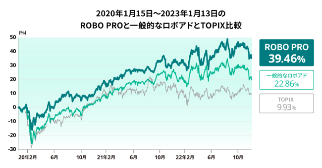 ROBO PROは、AIによる予測技術を利用して期待リターンを算出し、積極的な利益の追求や損失の軽減を目指す資産運用サービスです。ROBO PROの2020年1月15日~20232022年1月13日の期間における運用実績は+39.46%(※1)でした。これは一般的なロボアドバイザー(※2)と比較すると、以下のグラフのように+16.6%の差(※3)となりました。