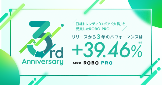 日経トレンディ(2023年2月号)で「ロボアド大賞」を受賞した、AI投資「ROBO PRO」は、サービスを開始してから2023年1月15日で3年が経過し、3年間の運用実績が+39.46%(※1)になったことをお知らせいたします。