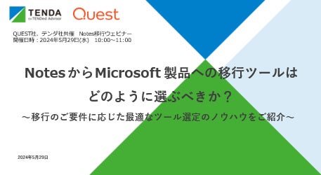 株式会社テンダ(本社/東京都渋谷区、代表取締役会長CEO/小林 謙、以下「テンダ」)は、2024年5月29日(水)にクエスト・ソフトウェア株式会社(以下「クエスト・ソフトウェア」)と共催で「Notes移行ウェビナー 第二回」を開催いたします。