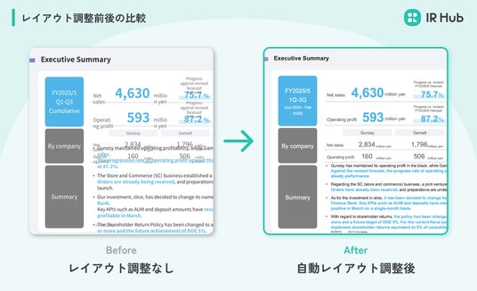 株式会社Gunosy(本社:東京都渋谷区、代表取締役社長:西尾健太郎、以下「Gunosy」)は、開示業務支援クラウドサービス「IR Hub(アイアールハブ)」において、決算説明資料の英訳作成時に、レイアウトを自動で調整する機能を正式にリリースしたことをお知らせします。