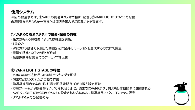 視聴者は投票期間中、VARKアプリ内ショップにて、候補者の総選挙用アバターTシャツ(490円)を購入することで投票することができます。