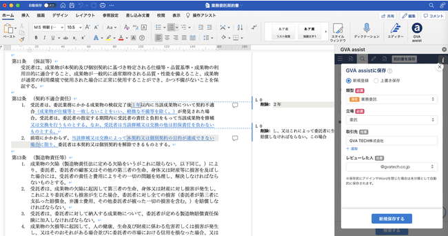そこで、審査終了時に「この契約書の条文は今後も利用できる」と思った契約書を、編集中のWordファイルからシームレスにGVA assistへアップロードすることで、過去契約書が後から活用しやすい形式で条文データベース化され、誰もが簡単に参考になる条文を修正履歴・吹き出しコメント付きで見つけて、再利用ができるようになります。