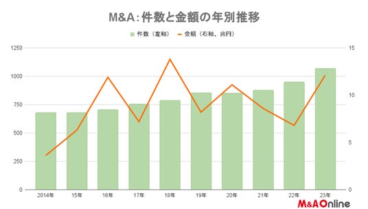 2023年のM&Aは件数、金額(適時開示ベース)ともにまれにみる活況を呈しました。総件数は1068件と3年連続で増加し、リーマンショック前年の2007年(1169件)以来16年ぶりに1000件の大台に乗せました。年間金額は前年比78%増の12兆1786億円(公表分を集計)でした。