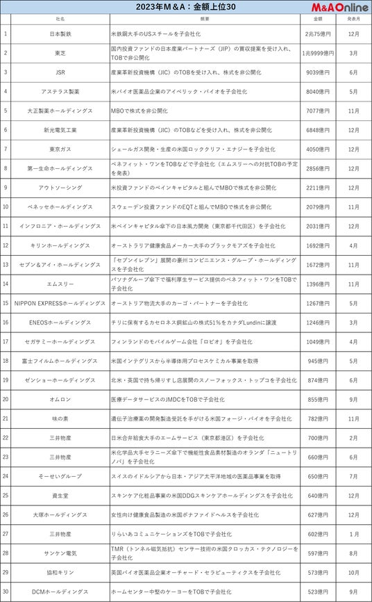 金額面では1兆円、あるいはこれに迫る超大型の案件が続出しました。日本製鉄による米鉄鋼大手USスチールの買収、東芝の非公開化がそれぞれ2兆円規模に達したのをはじめ、9000億円台、8000億円台、7000億円台、6000億円台が各1件で続きました。