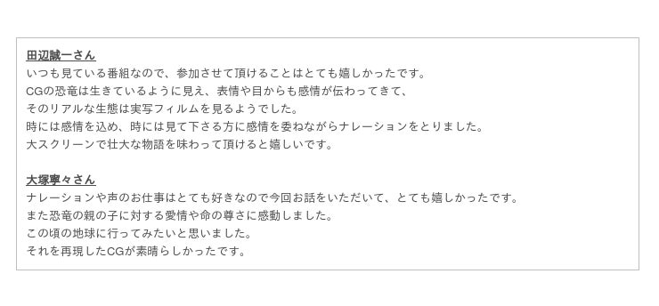 また、このたび、本作品のナレーションキャストを 映画やドラマなど 様々な分野で活躍中の田辺誠一さんと大塚寧々さんに務めていただくことも決定いたしました!お二人のナレーションによって、みなさんを一気に”恐竜たちの世界”へ導きます。