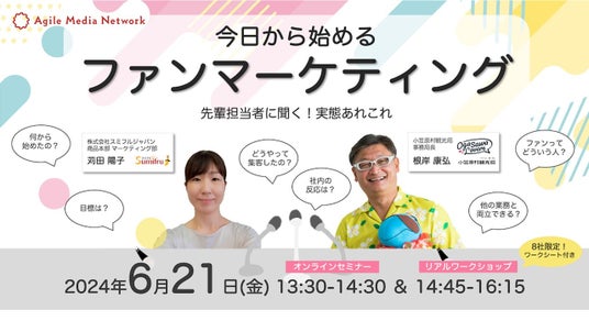 『世界中の“好き”を加速する』をビジョンに掲げ、ブランドのファン育成・活性化を手がけるアジャイルメディア・ネットワーク株式会社(本社:東京都港区、代表取締役社長:寺本直樹、東証グロース上場:証券コード6573、以下AMN)は、このたび『今日から始めるファンマーケティング』をテーマにした、オンラインセミナー&リアルワークショップを開催いたします。