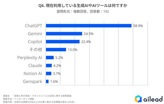 最も多く使われているのは「ChatGPT」(58.9%)。 一方で、営業現場に特化したAIツールの導入は限定的。 “ビジネスで使えるAI環境”はまだ整っていない実態が明らかに。