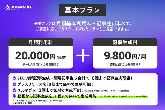 AMAIZINは、SEOライターのノウハウと生成AI(ChatGPT)を融合したAIコンテンツ生成サービス。本特長として、「ライターの記事制作工程を再現したプロンプトの実現」や、「生成AIの活用により、SEO対策に有効なテールワード記事の量産」により、成果が出ない・続けられないといった従来の課題を解消致します。