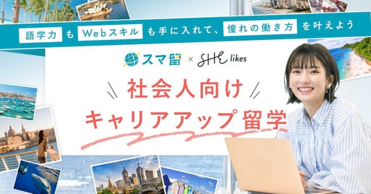 このような社会人の課題を解決するべく、当社の想いに共感いただいたSHEと協業し、社会人向けの新たな留学プログラムを販売することを決定いたしました。SHEが運営する「SHElikes」は時間や場所の制限無く、オンライン上のプラットフォームでWebスキルやクリエイティブスキル等の職種スキルを身につけることができます。SHEと協業することにより【海外留学サポート】と【キャリアサポート】の両方を叶えることが可能となり、留学希望者の人生の選択肢をさらに広げることができます。スマ留は、今後も業界の課題と真摯に向き合い、ユーザーのお悩みに寄り添ったサービス開発を進めてまいります。