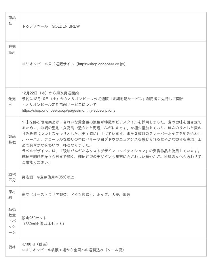 オリオンビール株式会社(本社:沖縄県豊見城市、代表取締役社長 兼 執行役員社長CEO 村野 一) はミニブリュワリー設備にて醸造した少量生産商品「トゥシヌユール GOLDEN BREW」を 250 セット限定で発売、12月10日(土)から先行予約を開始します。