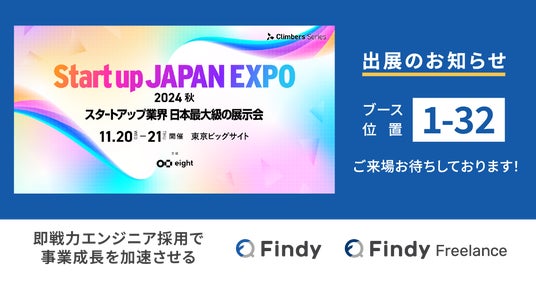 エンジニアプラットフォームを提供するファインディ株式会社(東京都品川区、代表取締役:山田 裕一朗、以下「当社」)は、11月20日(水)・21日(木)に開催される日本最大級のスタートアップ専門展「Climbers Startup JAPAN EXPO 2024」に出展いたします。