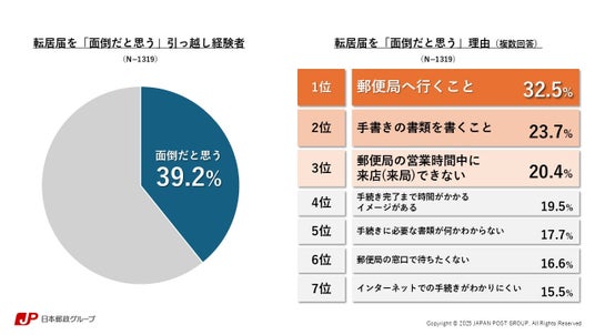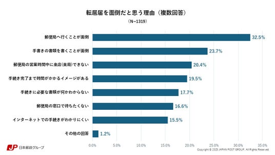 日本郵便株式会社が実施したWeb調査によると、引っ越し経験者の6割超が転居届の申し込みを「必ず実施している」と回答しました。一方で、転居届の申し込みを「面倒だと思う」と回答した引っ越し経験者は約4割に上ります。