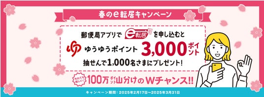 さらに、2025年2月17日(月)から同年3月31日(月)において、「郵便局アプリ」で「e転居」をご利用いただいたお客さまに「ゆうゆうポイント」が当たるキャンペーンを実施いたします。