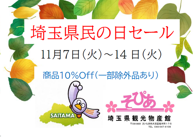 埼玉県物産観光館「そぴあ」では、11月14日(火)の県民の日の前6日間を「埼玉県民の日セール」と銘打って、埼玉を代表するおみやげ品を全品10%OFFで販売いたします。