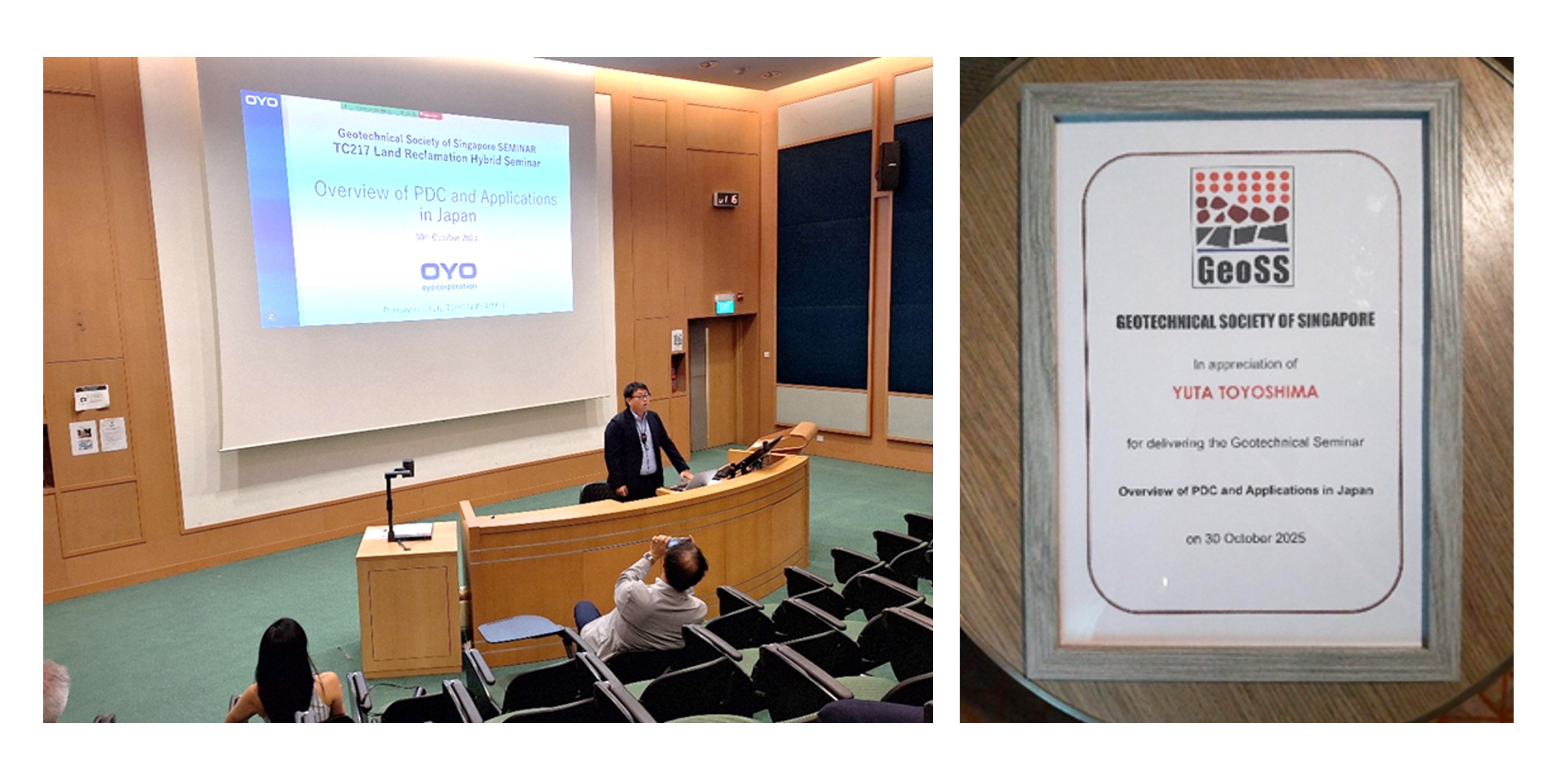 当該技術セミナーでは、PDCを利用した共同研究を行っている国立台湾大学土木工学科の葛宇甯教授がキーノートスピーカーを務め、シンガポール国立大学のセミナー室から、対面およびオンラインを組み合わせたハイブリッド形式で開催されました。参加者はオンライン66名を含む約100名にのぼり、多くのシンガポールの技術者に当社技術をアピールできました。講演後、GeoSS会員向けに新しい知見をもたらした当社の発表に対し、GeoSS会長 (シンガポール国立大学のChian Siau Chen, Darren准教授) より感謝状が贈られました。