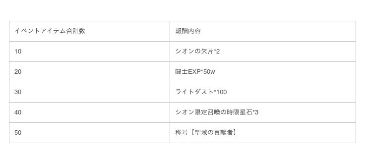 2.獲得したイベントアイテムが指定数に達すると、対応する報酬がもらえます。アイテムの数と報酬の対応関係は以下の通りです。