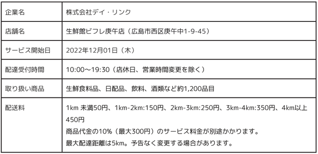 デリバリーサービス「Wolt(ウォルト)」を展開するWolt Japan株式会社では、広島エリアにおけるQコマース(食料品や日用品の即時配達サービス)をさらに強化いたします。2022年12月1日(木)より株式会社デイ・リンク(本社:広島市中区)が展開する「生鮮館ビフレ庚午店」(広島市西区)でサービスを開始し、生鮮食料品や日配品、飲料や酒類など約1,200品目を取り扱い、店舗から約5キロ圏内に30分程度でお届けします。