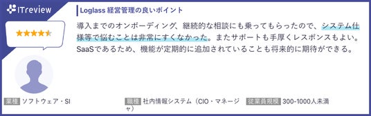 ▽「Loglass 経営管理」のご利用企業様からは、ITreviewにて以下のようなレビューをいただいています。(一部抜粋)