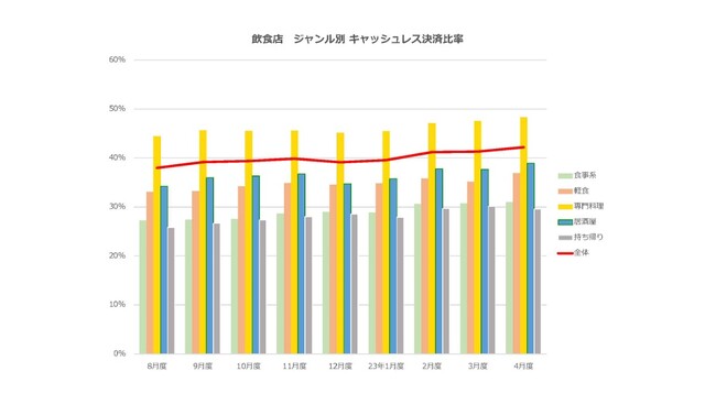 持ち帰りが30.1%から29.6%と減少したものの、それ以外の業態ではキャッシュレス決済比率が増加した。
