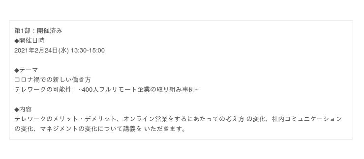 ◆リモートワークを導入する際に起こる悩みや、オンラインコミュニケーションのコツなどを具体的な事例を交えてお伝えしました。