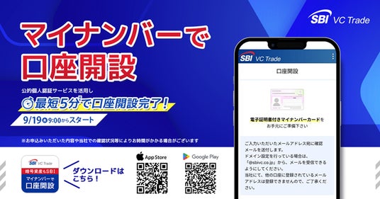 SBI VCトレード株式会社(本社:東京都港区、代表取締役社長:近藤 智彦、以下「当社」)は、2024年9月19日(木)より、マイナンバーカードの公的個人認証サービスを活用し最短5分で口座開設が完了する「マイナンバーで口座開設」アプリの提供を開始することをお知らせいたします。