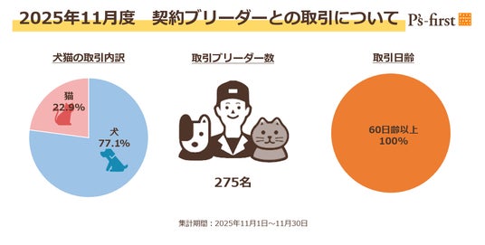P’s-first直営店では、オークションなどの第三者を経由せず、全国の信頼できる契約ブリーダーからペットを直接取引しています。2025年11月1日から11月30日までにペッツファーストグループが取り扱ったペット、すなわち契約ブリーダーから引き受けたペットの頭数が1,932頭、そのうち犬が77.1%、猫が22.9%です。なお、11月度に引き受けたペットたちは275名の契約ブリーダーと取引いたしました。