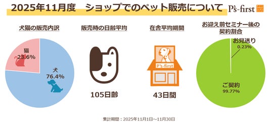 “Pets always come first”を理念に掲げるペッツファーストホールディングス株式会社(本社:東京都目⿊区、社長:正宗 伸麻)は、ペットショップ「Pʼs-first」直営店の 2025年11月度における流通過程の重要指標をご報告いたします。