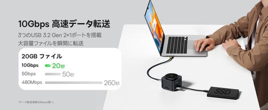 USB-A 及び USB-C の端子には外付けハードディスク、そのほかの周辺機器の接続ができ、最大10Gbpsの転送速度に対応しています。SD カードからのデータの読み書きなどが高速に行え動画編集などの作業効率を向上させます。