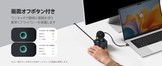 本体前面に瞬時に外部モニターをオフにできる画面オフボタンを装備。LED インジケーターとしての機能も兼ね備えてており本体のステータスを確認することもできます。