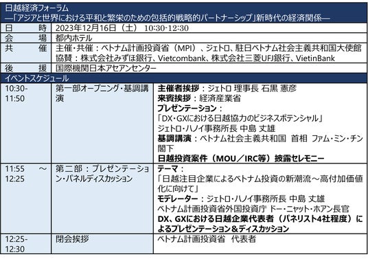 日越経済フォーラムは、「アジアと世界における平和と繁栄のための包括的戦略的パートナーシップ」新時代の経済関係をテーマとし、ファム・ミン・チン首相による就任後3度目の訪日を記念し開催されました。