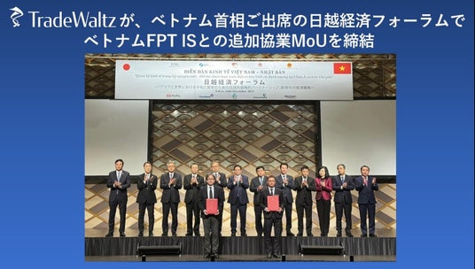 貿易情報連携プラットフォーム「TradeWaltz(R)︎」を運営する株式会社トレードワルツ(以下:トレードワルツ)は、2023年12月16日、都内で開催された日越経済フォーラムに出席し、ベトナム大手IT企業で当地税関システム運営者かつベトナム初の貿易プラットフォームTradeFlatを開発したベトナムFPT Information Systems Corporation社(以下「FPT社」)と追加のマーケティング協業MoUを締結しました。